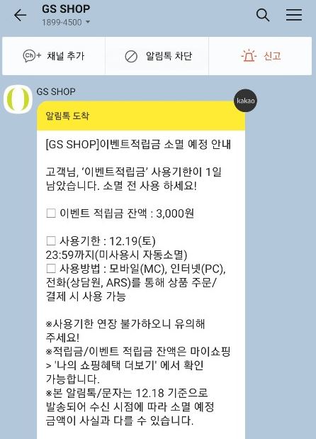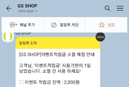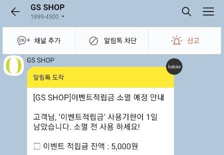 gs shop 이벤트 적립금이 소멸 된다며, 소멸 되기전 빨리 사용하라는 메시지가 도착해있다.