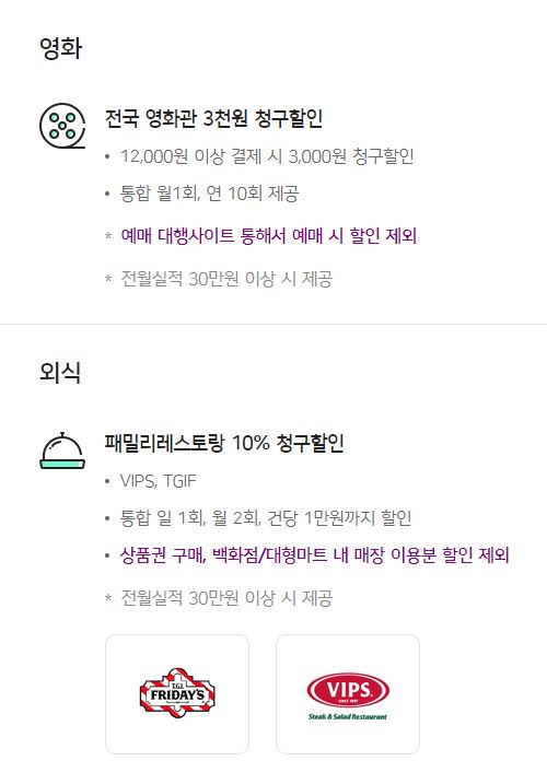 전국 영화관에서 12,000원 이상 결제시 3천원 청구할인과 빕스와 tgif 에서 10%도 청구할인 받을 수 있다. 코로나때문에
