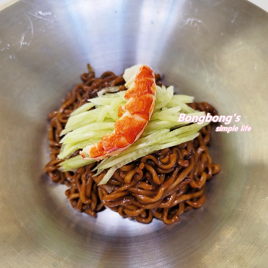 오늘은 딱 4마리만 쪄서 짜파게티 위에 고명으로 장식 해주 었다.