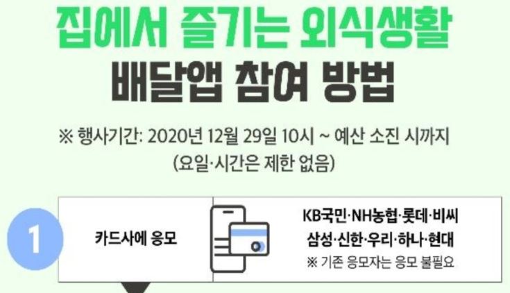 집에서 즐기는 외식생활 배달지원금 행사기간은 2020년 12월 29일부터 ( 이미 시작했군) 예산 소진시까지다.요일과 시간은 제한이 없다. 배달 외식비 지원을 받기 위해선 내가 사용하고 있는 카드사에서 직접 응모해야한다. KB국민 / NH농협 / 롯데 / 비씨 / 삼성 / 신한/ 우리 / 하나 / 현대 총 9개의 카드사에서 응모해야 한다. 신한카드 신청방법은 신한카드 이벤트 페이지에 접속하면 바로 신청할 수 있다.