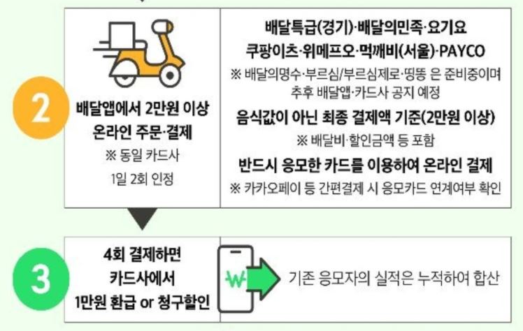배달지원금은 동일카드사는 1일 2회로 인정된다. 예를 들면 , 신한카드로 응모를 완료했다. 그렇면 배달의민족에서 최종결제액을 기준으로 2만원 이상을 신한카드로 결제하면된다. 하루에 2번까지 실적으로 인정되니 3번은 시켜먹지 말자.ㅋㅋ 이렇게 4번을 배달앱을 통해 주문을 하면 만원을 환급 받을 수 있다. 꿀이득!