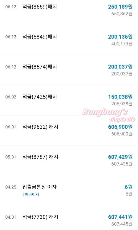 그렇지만.. 그 힘든 1년을 참아내고 저금을 하면 1년 후에는 매달 원금 60만원과 소정의 이자가 내 통장으로 입금되는 기적을 만끽할 수있다. 카카오뱅크의 입금 내역을 확인하니 매월 1일 적금 해지를 통해 60만원 초반대의 금액이 입금되고 있다. 매달 입금되는 금액이 다른 이유는 매달 적금을 가입하니니까 카카오뱅크 적금이자가 서서히 내려가기 때문.. ㅎㅎ