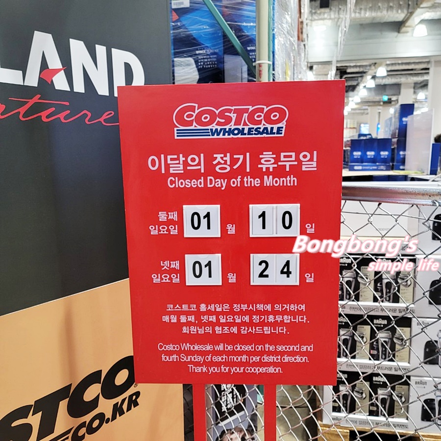 대구 코스트코 대구점 휴무일은 1월 10일 일요일, 1월 24일 일요일 2번 쉰다. 이미 지나갔지만~ 1월1일 신정도 휴무였다. 매월 둘째, 넷째 일요일은 휴무일이니 참고하면 되겠다. 영업시간은 오전 9시부터 밤 10시까지 이용할 수 있다.
