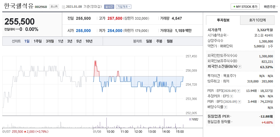 한국쉘석유 주가는 내가 매수당시 매우 비쌌던걸로 기억난다. 그래서 2주? 밖에 못 샀는데.. 그게 계속 마이너스니 속이 상할수밖에..