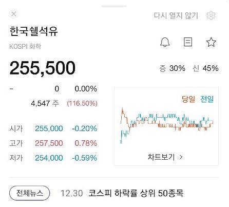 오늘자 기준으로 -12.93%를 기록중이다. (오늘 1주 추가매수함..ㅋㅋ) 그런데 이것도 많이 회복되었단 사실.. 몇 달 전에는 30?40% 까지 내려간적이 있었다. 한국쉘석유 주가가 이렇게 계속 내리막일줄 예상했다면 이 돈으로 삼성전자를 사는건데.. 그럼 엄청 올랐을텐데.. 아쉽단 생각이 하루에도 몇 번씩 들곤 한다. 그리고 손해보면서.. 매도 할까 말까? 매일 고민한다. 지금 현재 마이너스 수익을 기록중인데 ,매도를 하게되면 손실은 확정이며, 그와 함께 세금도 지출 되기에 매도에는 신중을 기해야 한다.