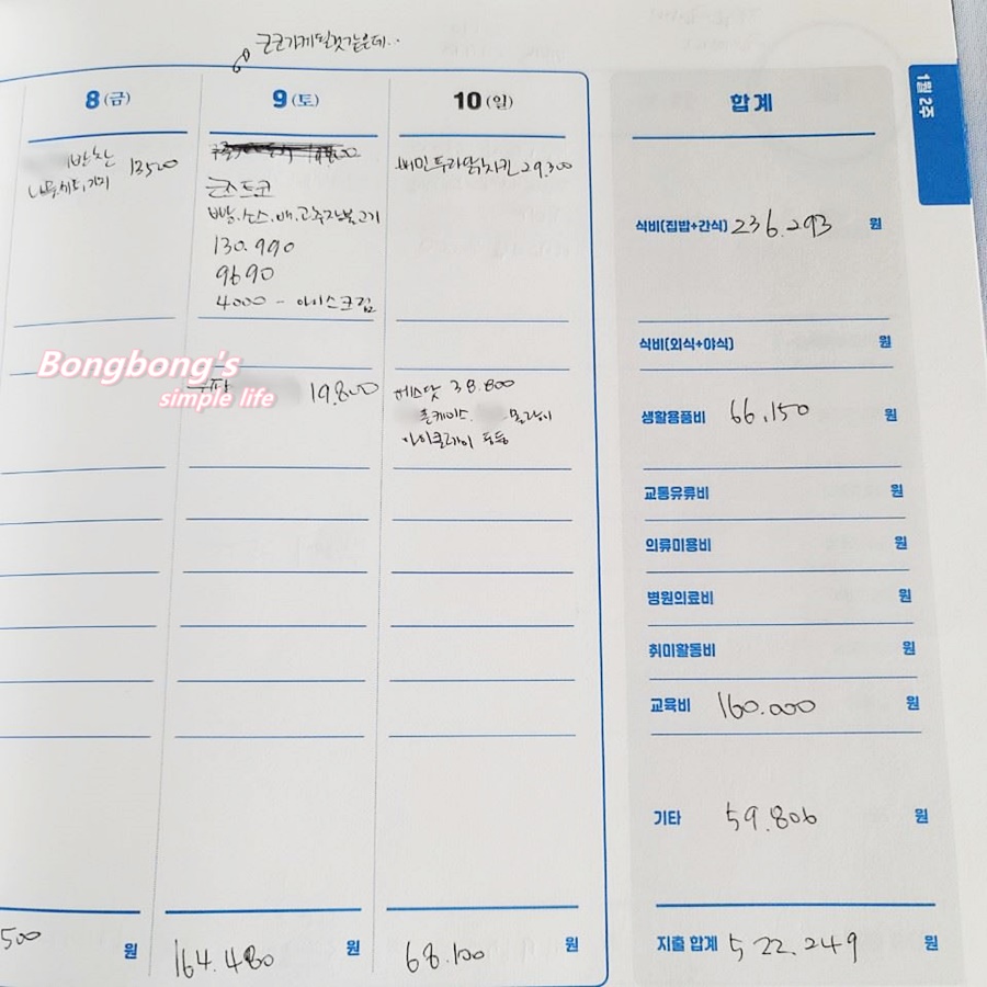 이렇게 저렇게 사용한 금액을 계산하니 362.249 원.. 생활비 가계부를 작성중이므로, 아이의 학원비 16만원은 적기는 했지만 예산에서 금액을 차감하지 않았다.
