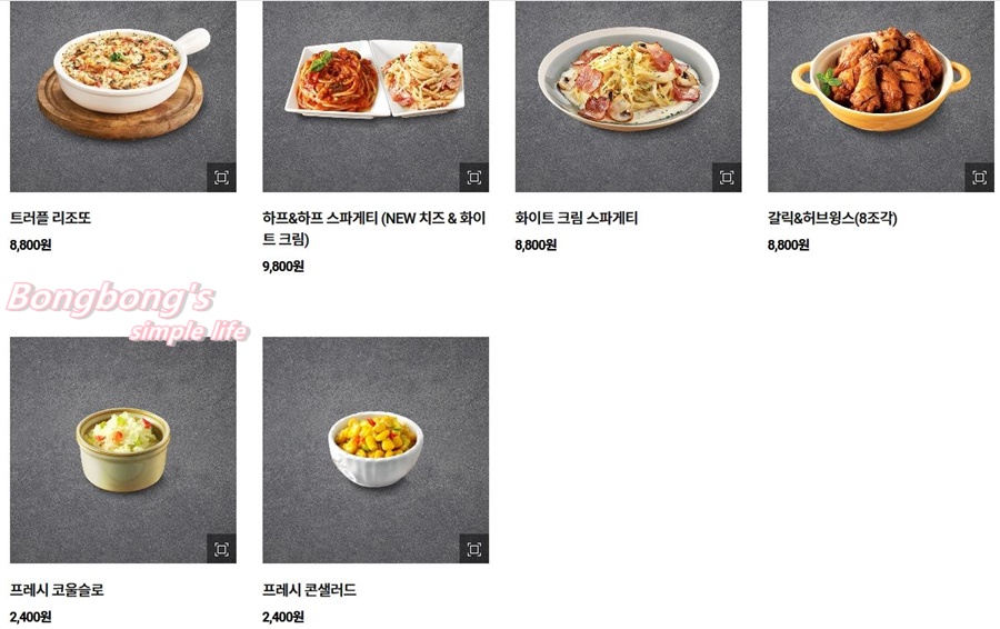 피쟈를 먹을때 곁들여 먹는 사이드디쉬도 종류가 많다. 특히 특정 피쟈를 주문하면 반값에 구입할 수 있으므로 반값으로 주문할수있으면 무조건 주문을 해야 한다!!! 블랙타이커 슈림프 알리오 올리오 파스타와 셰프's 토마토 파스타, 트러플 바질 파스타,스파이시 씨푸드 로제 파스타는 새로나왔기에 꼭 먹어봐야겠단 생각이 들었다. 그리고 크리스피 핫 순살 치킨 조각도 맥주or 콜라와 곁들여 먹으면 참 맛있으리라~ 건강하게 먹고 싶다면 샐러드 가든 짐콩 하시길!