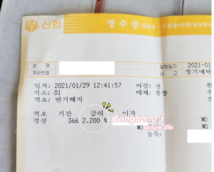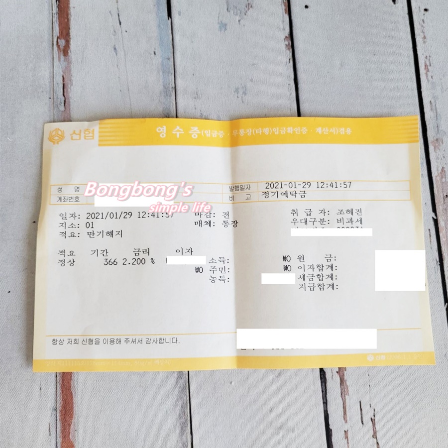이 모든걸 감안하고 신협 1년 정기예금 금리 2%로 재예치하고 왔다. 요즘 같은 저금리 시대에 2%는 꽤 괜찮은 편이라 생각이든다. 비과세 혜택까지 받을 수 있으니까!