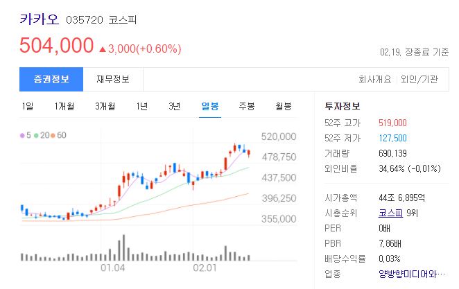 50만원을 훌쩍 넘긴 카카오 주가를