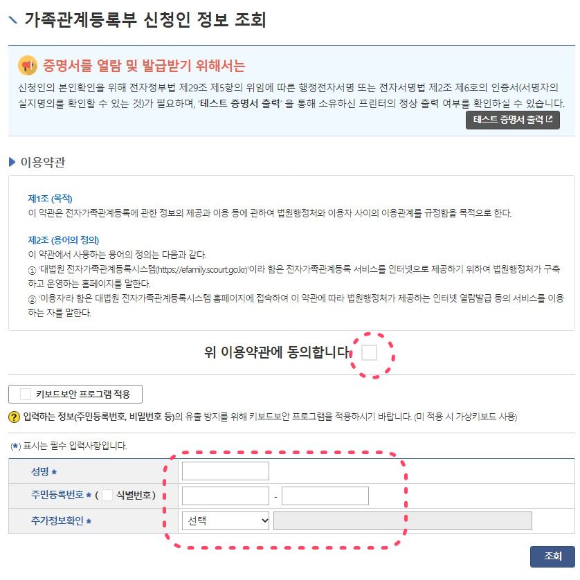 배우자 이름, 자녀이름 등을 넣고 조회버튼을 눌러준다.